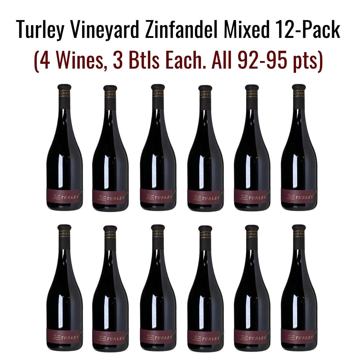 This one is by far the best value that we’ve ever had from Turley before. This is a spectacular mixed Red case. All super highly rated Zinfandels. They all come in between 92 and 95 points. Each mixed case includes the following: